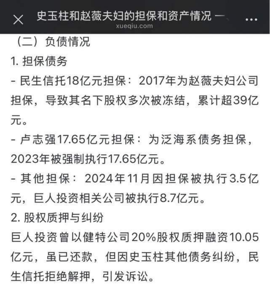 投资者APP雪球用户“@30老迈韭菜”曾总结过史玉柱主要的担保:有帮赵薇及“前夫”黄有龙公司作念的18亿元民生信赖担保;以及为卢志强作念的17.65亿元担保;还有其他约莫12亿元的担保。此外,还与民生信赖有10亿元的质押纠纷。共计约58亿元。