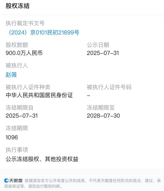 2025年7月末,北京市东城区东说念主民法院诱骗对赵薇下达三份股权冻结裁定。赵薇名下三家公司的股权被冻结,总数达1590万元。其中,芜湖东润发投资有限包袱公司(赵薇合手股90%)被冻结的900万元股权。西藏龙薇文化传媒有限公司(赵薇合手股95%)、合宝娱乐集团有限公司(赵薇合手股4.51%)远离被冻结190万、500万,冻结期限均为三年。从本年7月底至2028年7月原本领,冻结股权将被梗阻转让或质押。推行依据为法院裁定书((2024)京0101民初21899号。