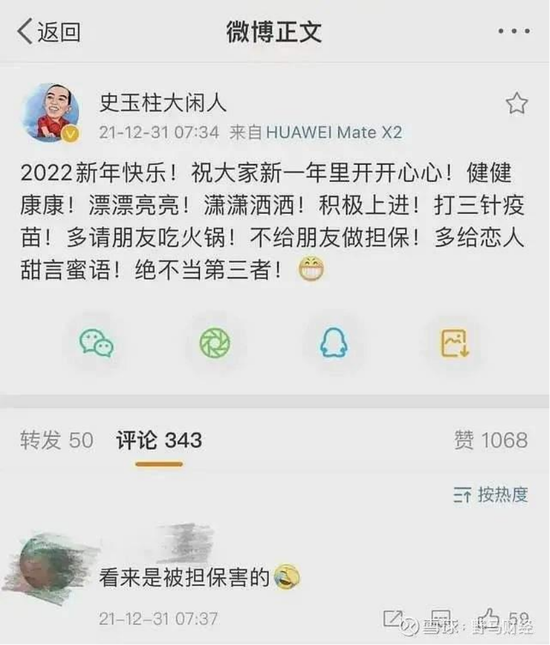 在2021年的临了一天,史玉柱还也曾发过一头绪由深长的微博。他说:“多请一又友吃暖锅!不给一又友作念担保!”